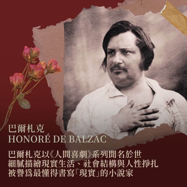 19世紀法國文學巨匠,以《人間喜劇》系列聞名於世,細膩描繪現實生活、社會結構與人性掙扎。他致力於用文學重現一個完整的社會縮影,被譽為最懂得書寫「現實」的小說家。