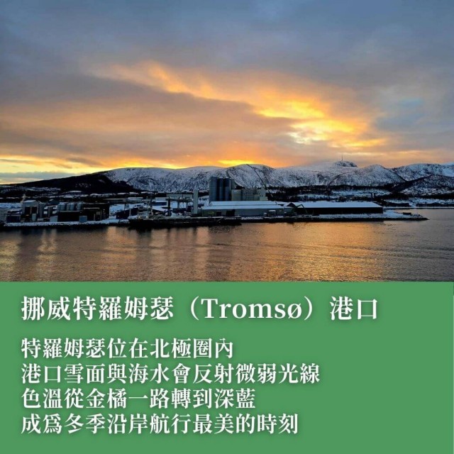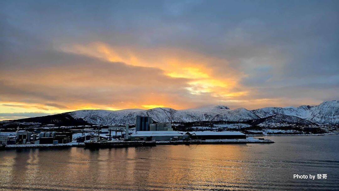 特羅姆瑟位在北極圈內,冬季太陽高度很低,日落不會「一下就黑」,而是拉出一段很長的暮光帶。港口雪面與海水會把微弱光線反射回來,讓船身、碼頭設備、木造建物輪廓更清晰;加上空氣乾冷、雜質少,光線穿透力更強,色溫從金橘一路轉到深藍,成為冬季沿岸航行最容易拍出層次的時刻。