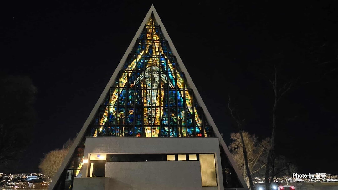 北極大教堂(Ishavskatedralen)是特羅姆瑟的地標,1965年落成,以連續三角形混凝土板構成,外觀常被形容像冰山、也像帳篷,呼應極地風雪與北方信仰的庇護感。室內最醒目的是大型彩繪玻璃(後期增設),利用冬季低角度自然光,把冷冽的白與藍轉為柔和色帶;教堂也經常舉辦音樂會,成為旅人理解「北境生活不是只有荒寒」的一個入口。