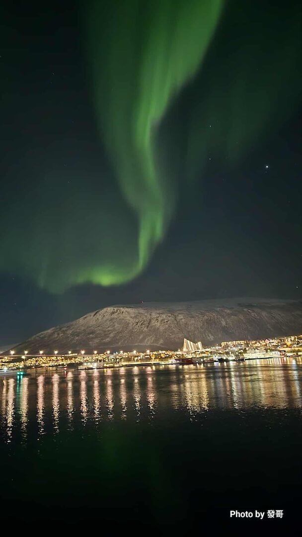 極光源於太陽風粒子進入地球磁場後,在高空與氧、氮分子碰撞而發光;最常見的綠色多出現在較低高度的大氣層,因此在特羅姆瑟附近特別容易觀測。當夜色夠暗、雲量少,綠色光帶會像絲帶般變形流動;城市燈火倒映在港灣水面,提供「人造光」的穩定基準,反而更襯托天空中自然光的變化速度與方向感——這種對比,是冬季北上航線最值得期待的視覺重點。