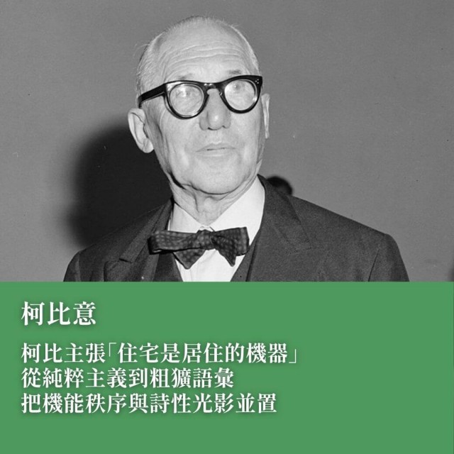 柯比意(1887–1965)瑞士出身、以筆名在法國成名,原名Charles-Édouard Jeanneret-Gris。從純粹主義到粗獷語彙,主張「住宅是居住的機器」,把機能秩序與詩性光影並置。