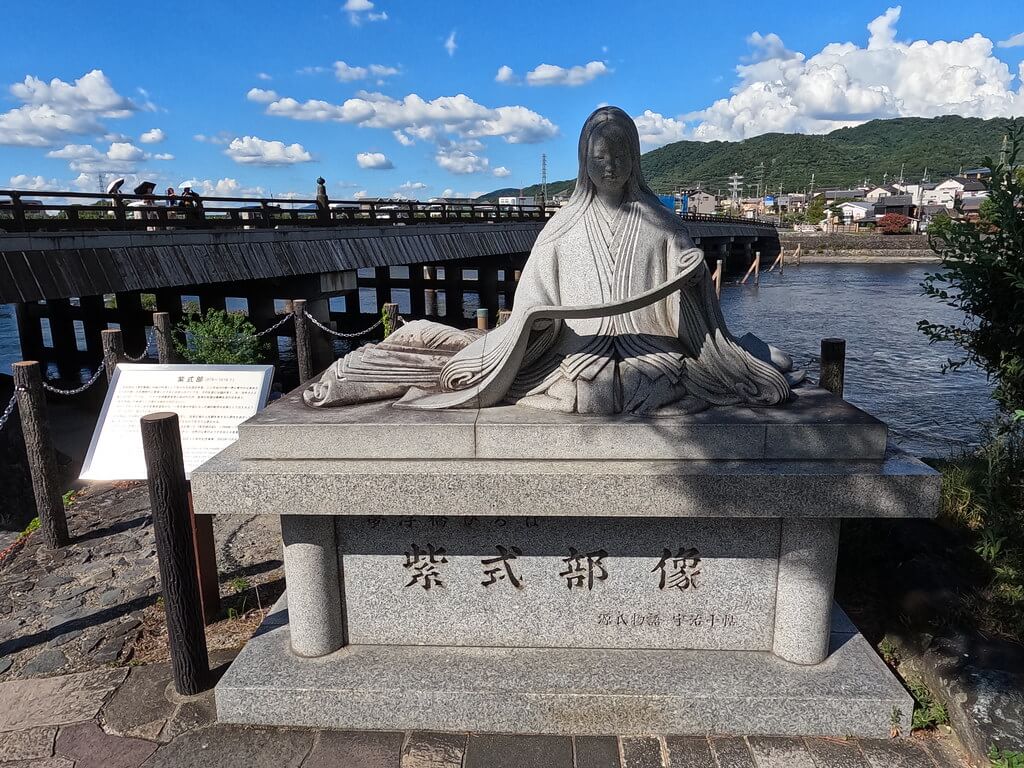 這座雕像位於京都宇治市,正是《源氏物語》後半「宇治十帖」的故事舞台。紫式部坐於橋邊低眉沉思,象徵她筆下對愛情、命運與時間的深刻描寫,也成為文學朝聖者重要的拜訪地。