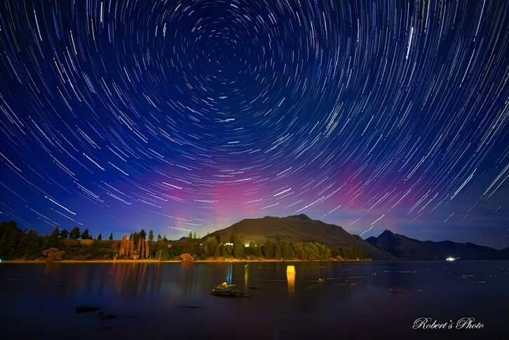不必遠征到世界盡頭,有時候最震撼的畫面,竟然就發生在「我家門前」:星軌慢慢繞出光圈,南極光在遠處跳舞——一張照片兩種宇宙奇蹟!(2025/05/02 皇后鎮)