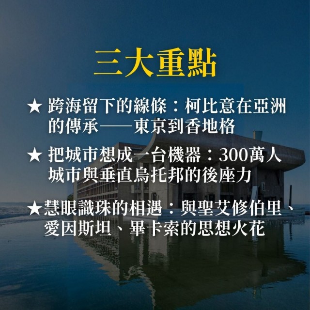 第三部曲把視線拉到公共空間與世界舞台:東京國立西洋美術館以松方幸次郎收藏為起點,串起柯比意與日本弟子前川國男的傳承;螺旋動線與「無限成長的博物館」概念,讓美術館像一個可擴張的城市器官。再從純粹主義的幾何秩序一路讀到香地格行政中心、垂直城市想像,甚至他與愛因斯坦談模矩、與《小王子》作者聖艾修伯里在航空時代交會的花邊故事——你會看見:柯比意的現代美學,從來不是一種風格,而是一整套改寫生活與城市的野心!