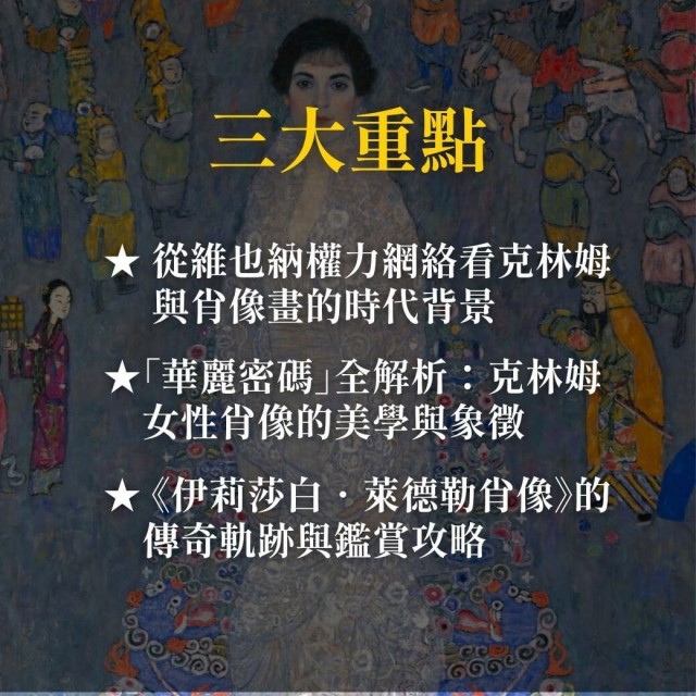 金光閃閃,真的不只是好看而已。從早期還算「乖乖牌」的《Frauenbildnis》,到《Sonja Knips》大膽採用正方形構圖的時尚突破,再到《愛黛兒一號》《愛黛兒二號》全面爆發的金箔與裝飾語言,克林姆一步步把女性肖像變成心理與象徵的舞台。裙子上的圖案、背景的花紋、人物若即若離的眼神,全都不是裝飾,而是他用來說故事的語言。這場講座,將拆解那些你「看過卻沒看懂」的細節,讓名媛不再只是名媛。