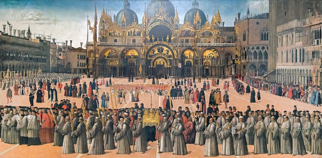 貝里尼《聖馬可廣場遊行》描繪真十字架聖物在廣場繞行:信眾與兄弟會成員魚貫而行,奇蹟只藏在畫面一角,反而讓壯麗的廣場與教堂成為主角。這幅畫像是一張「宗教街景照」,記錄威尼斯如何在日常都市空間中遊行、祈禱,也把城市本身推上朝聖與信仰的舞台。